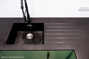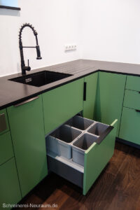 Die moderne Einbaucküche wirkt duch das Grün frisch und lebndig. In verbindung mit dem dunklen Holzboden erinnert sie an einen Wald. Die leufwege sind kurz und ermöglichen ein effizientes arbeiten. Die Corian arbeitsflächen wirken leicht und sind sehr robust und pflegeleicht.