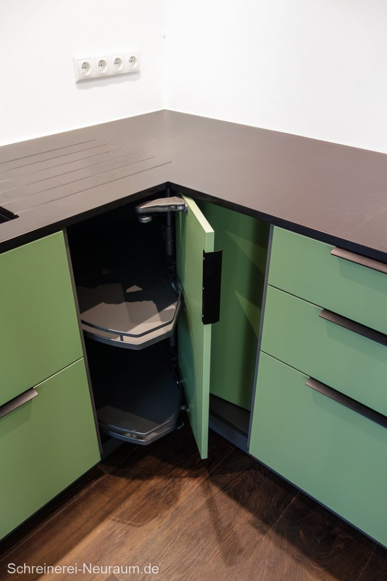 Die moderne Einbauküche wirkt duch das Grün frisch und lebendig. Die Laufwege sind kurz und ermöglichen ein effizientes Arbeiten. Die Corian Arbeitsflächen wirken leicht und sind sehr robust und pflegeleicht.